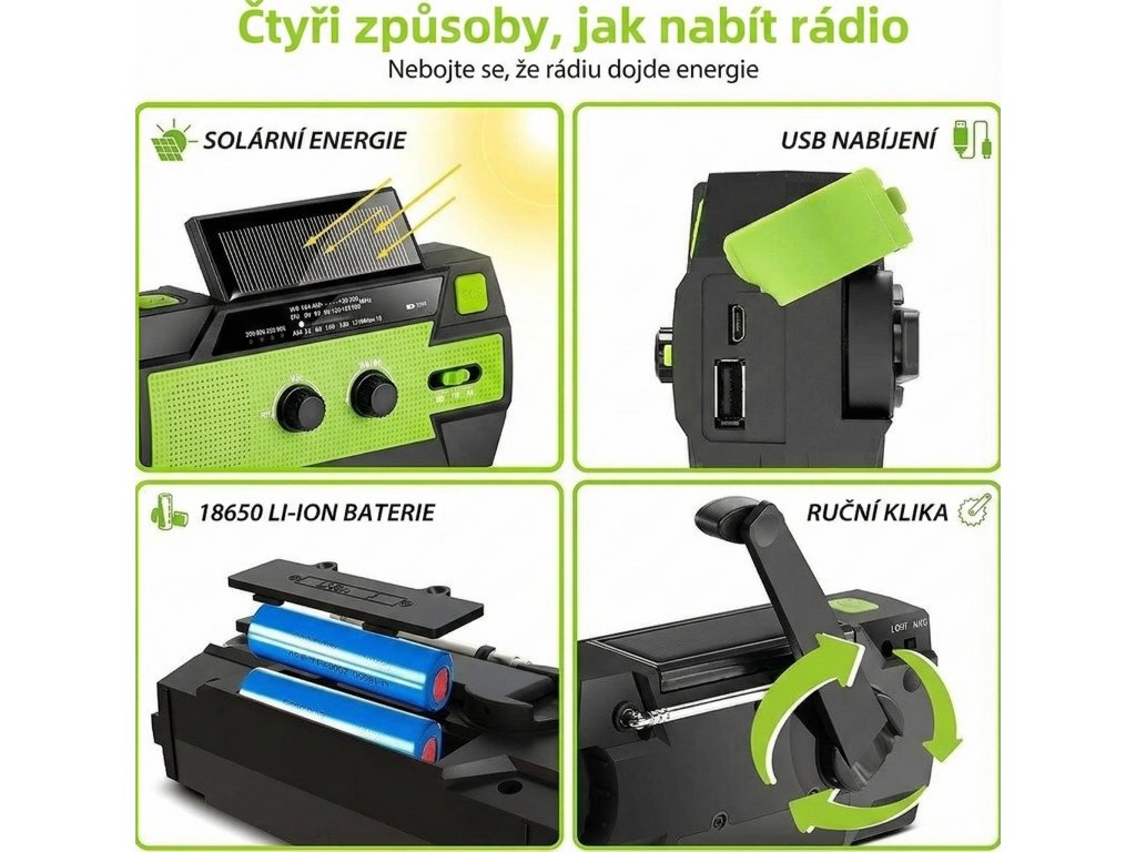Toto praktické multifunkční rádio je ideální pro nouzové situace, kempování nebo místa bez přístupu k elektrické síti. Nabízí široké spektrum funkcí, včetně rádia AM/FM, LED svítilny, powerbanky a SOS alarmu. Díky čtyřem možnostem nabíjení jej lze snadno udržet v provozu i bez elektrické zásuvky.
