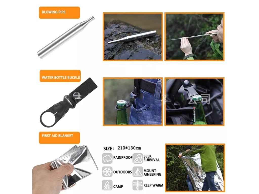 Velký balíček přežití 42 v 1. Vynikající jako první pomoc v nouzi. Mějte všechny praktické potřeby na jednom místě. Vhodný i jako nouzová výbava v domácnosti připravená k nečekanému přesunu mimo domov. Lze připevnit na batoh pomocí popruhů. Vynikající doplněk povinné výbavy v každém autě, na chalupě nebo na delší výlet do přírody, stanovačku a pod.